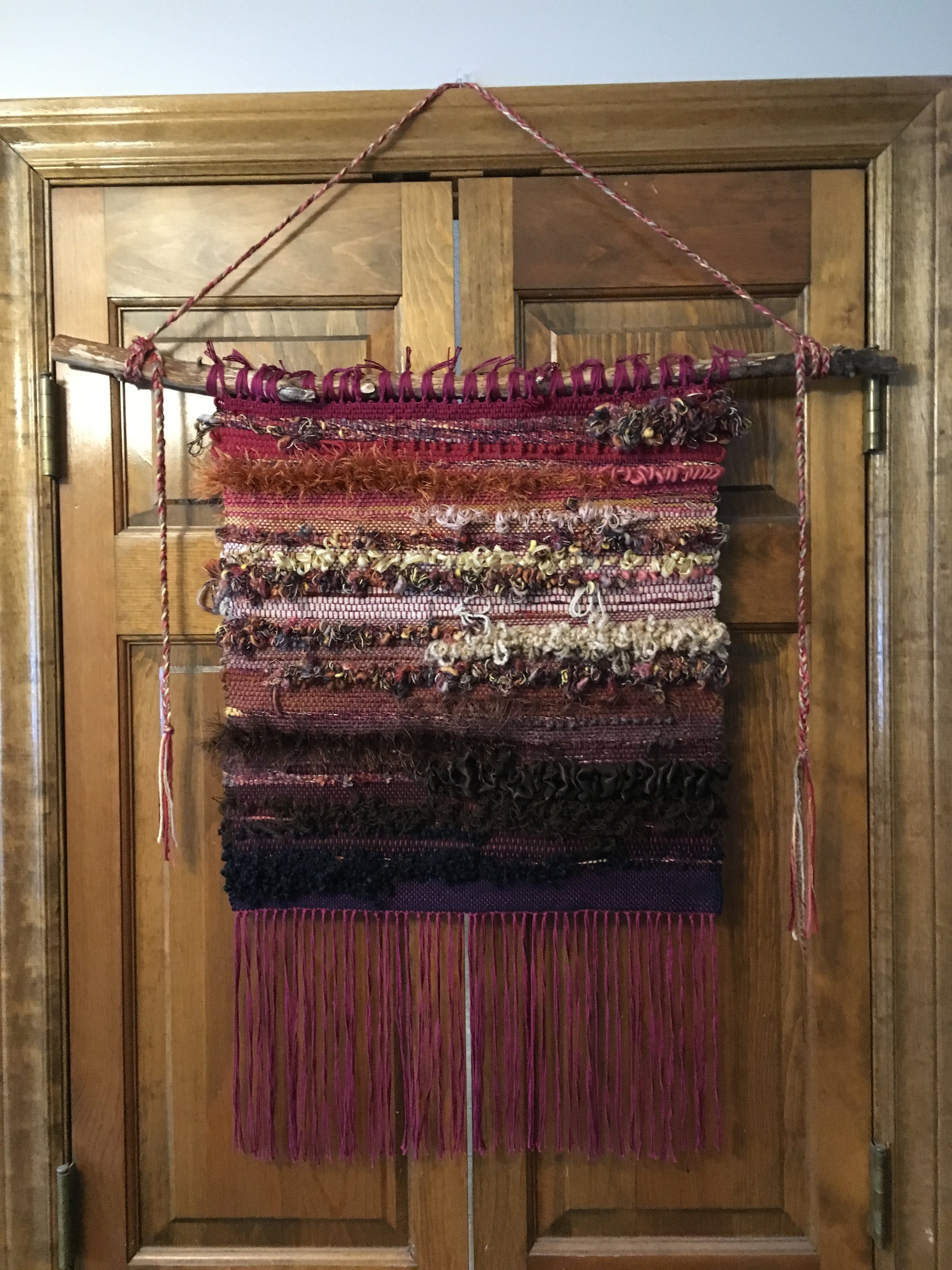Unique one-of-a-kind wall art pieces are inspired by the repurposed materials chosen. Colors and textures guide the design as much as my own intuition brings each piece to life. My handmade weavings are intentionally made with reclaimed bits and pieces of yarn and discarded fibers; items forgotten, tossed aside, or worn-to-threadbare. Each creation is an exploration in the surface-story which emerges through latent memories held within the materials. Often an emotional or vibrational connection is felt by the viewer.